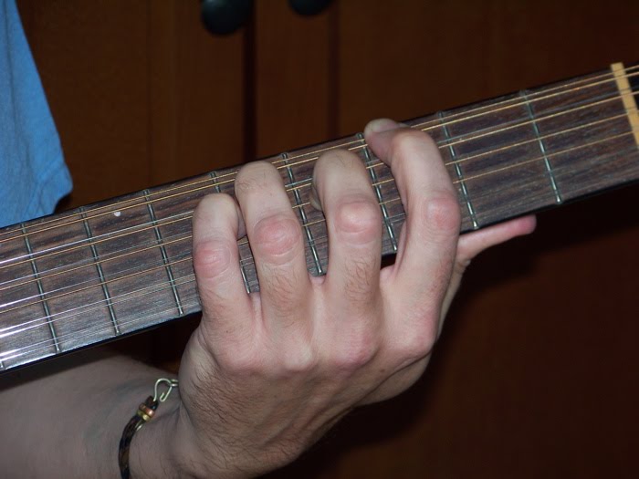These are typical poses. I'm fretting a chord we'll call G 6th (no 3rd). And meanwhile, my right hand is flat-picking and strumming (there's a Fender thin blue confetti pick in there somewhere).